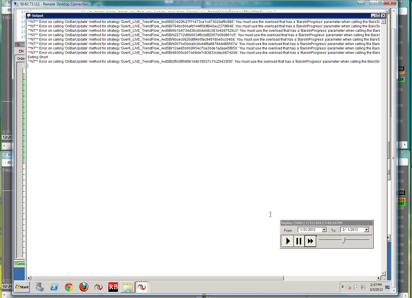 I ran market replay from 1-31-13 6 pm est to 2-01-13 4:50 pm est...this is the output I got but nothing exited. However, I noticed a BarsSinceEntry() error. I don't think I get this in real time though because it has bars to look back when I initially load. Let me know what your thoughts on this are? See attached.