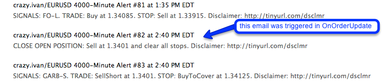 The problem I'm having is that I am not receiving an email to close the old position when a position is being flipped. I do receive an email about the new entry and to set a new stop as the former is handled in my OnOrderUpdate method and the latter in my OnExecution() method.