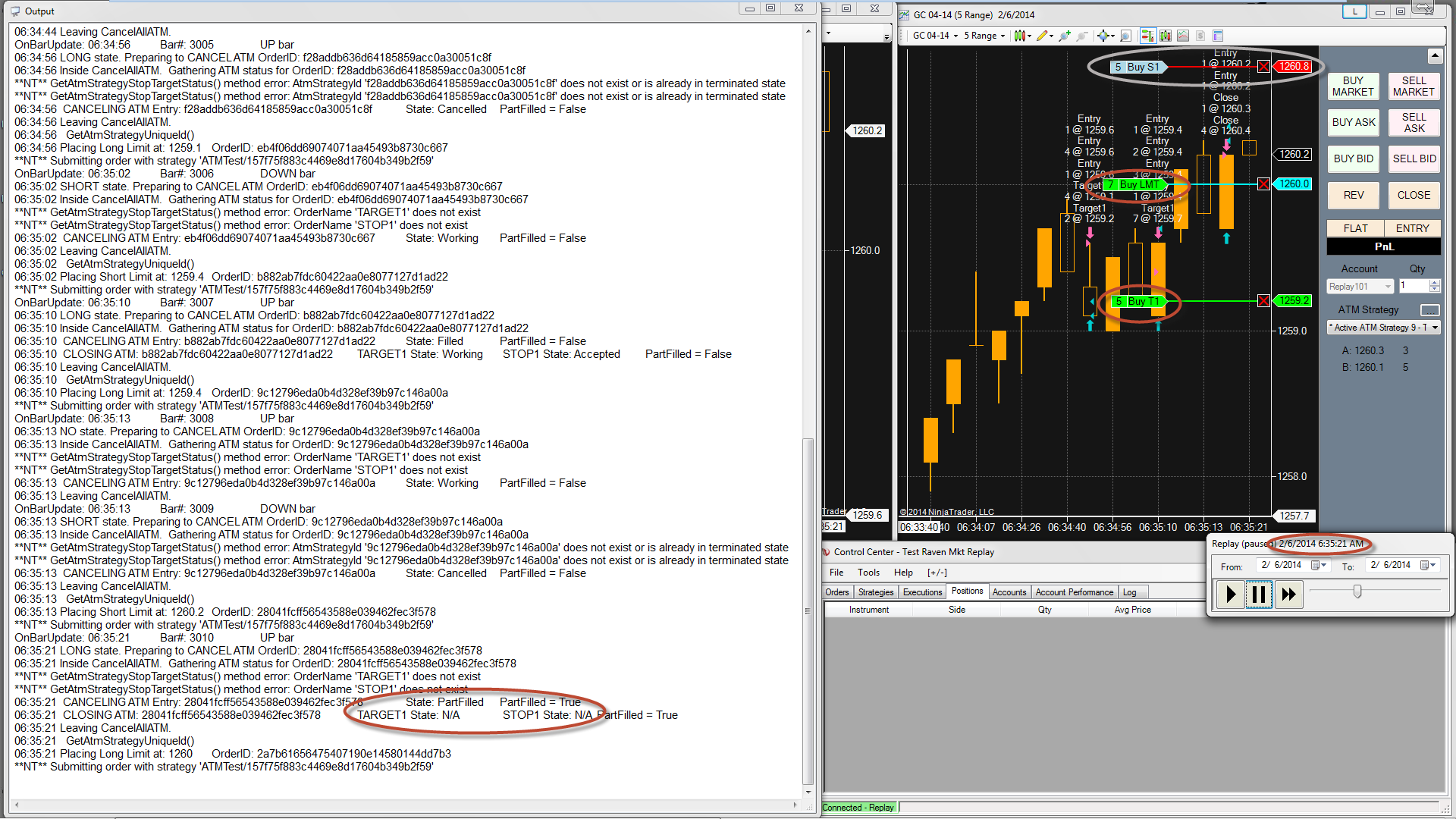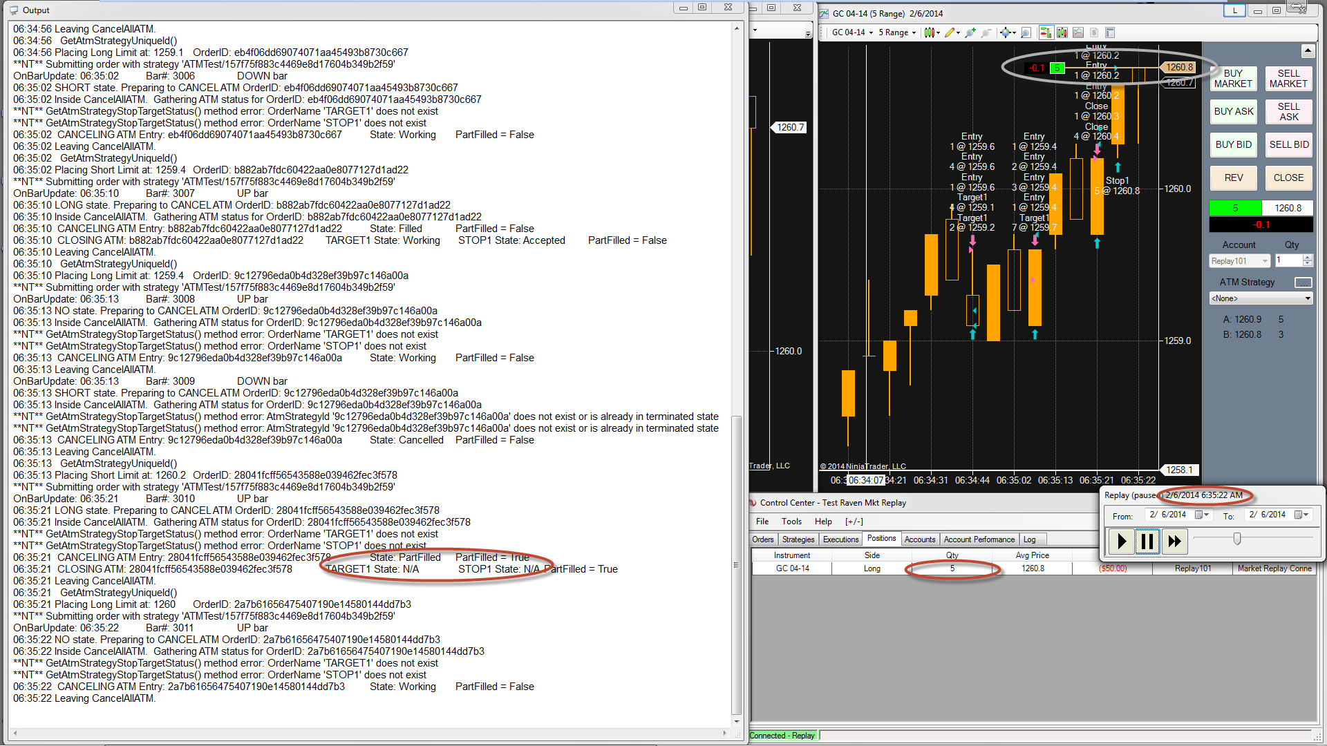 Thanks for the video. I noticed you did not test the code during the specific date & time or instrument that I gave in my original post, that will recreate the issue every time. Also, you were discussing entries that did not have a partial fill. The debug prints to the Output Window I posted above is showing a partial fill of 5 Short contracts(that are highlighted in bold). I have attached screenshots with Chart Trader showing a Stop & Traget in place, but GetAtmStrategyStopTargetOrderStatus() is NOT recognizing them.