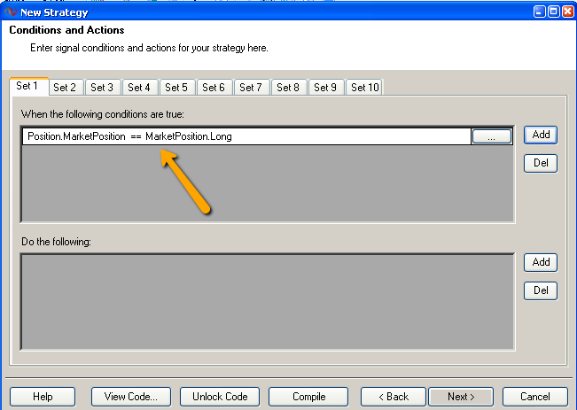 When done, your filter should read: if (Position.MarketPosition != MarketPosition.Long)