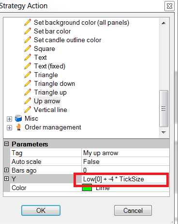 DrawArrowUp("My up arrow" + CurrentBar, false, 0, High[0] + 4 * TickSize, Color.Lime);