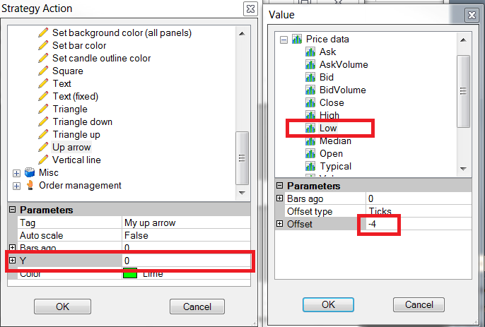 You would want to do the same thing but on the opposite side for the cross below and in that case, you can use the High[0] + 4 ticks.