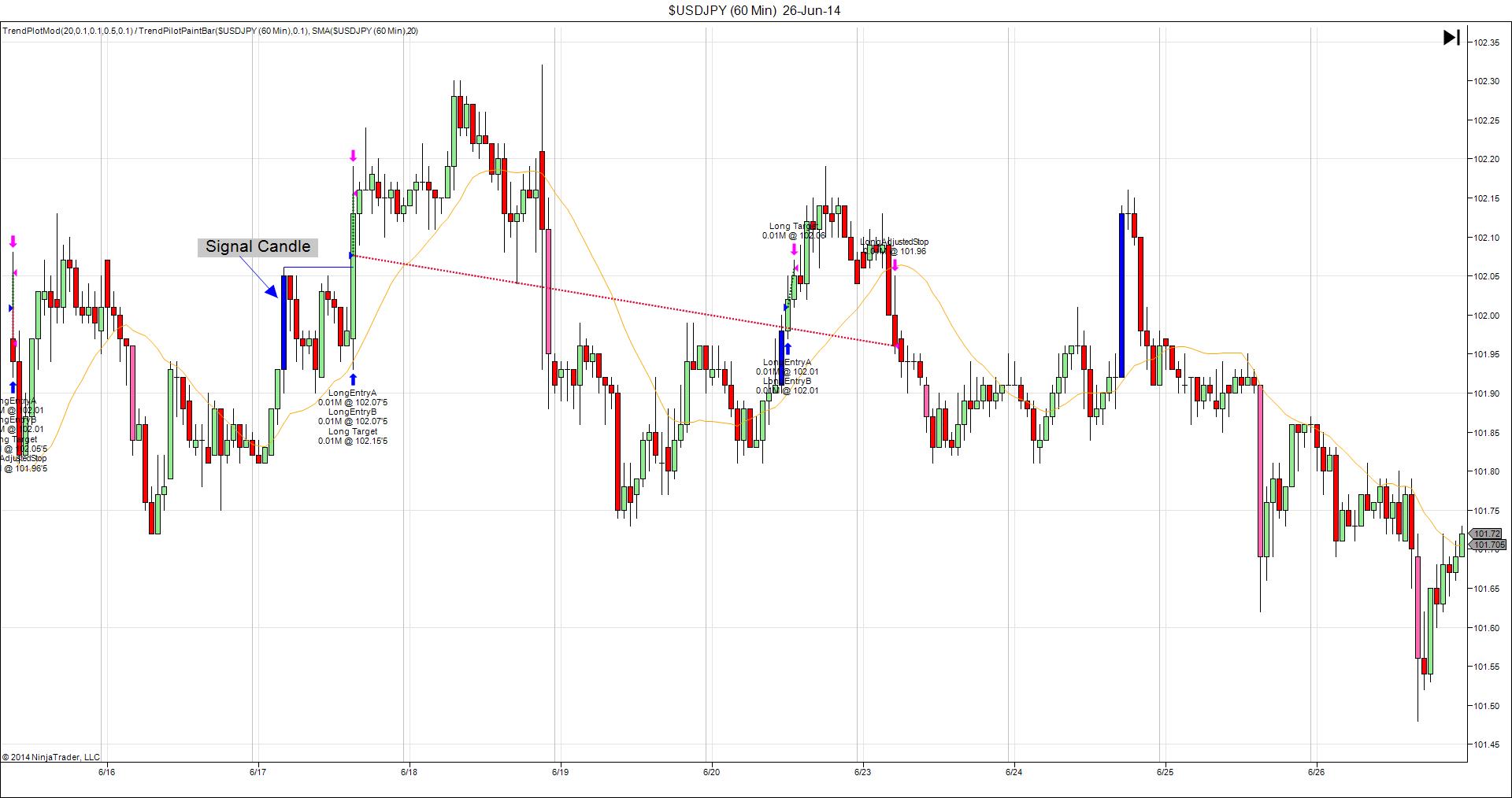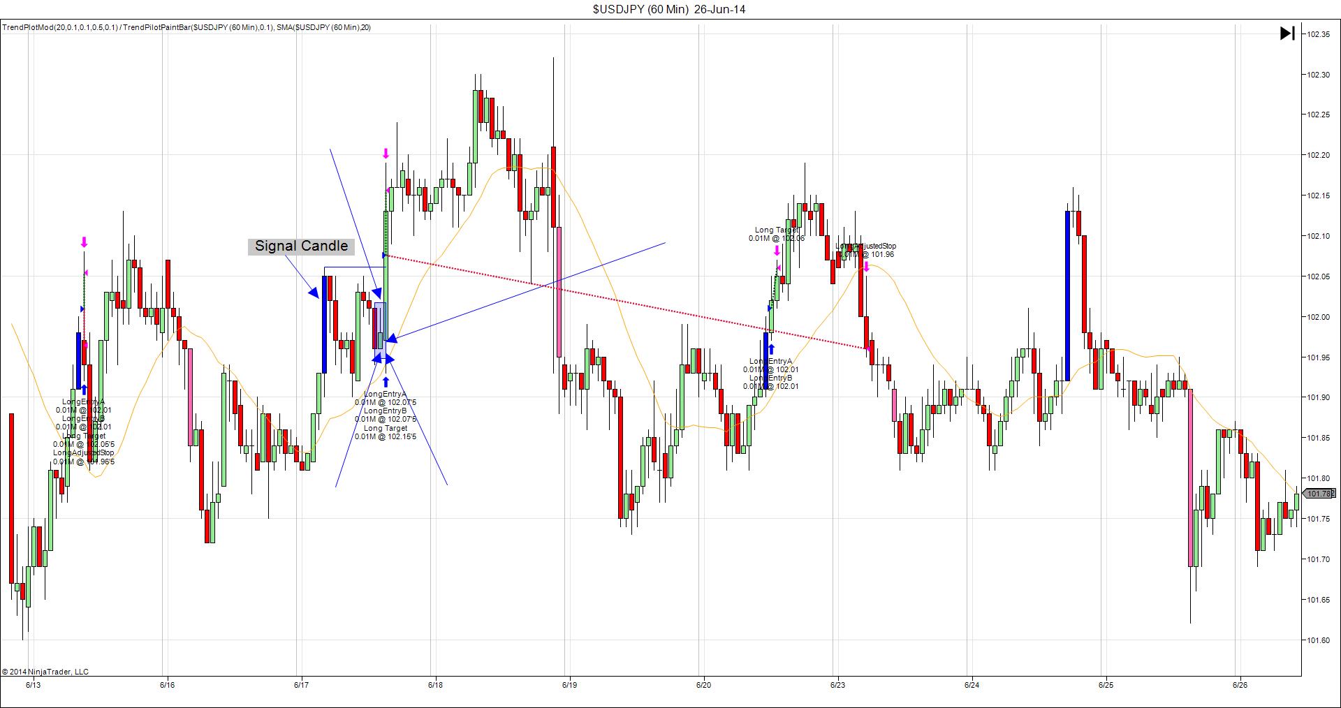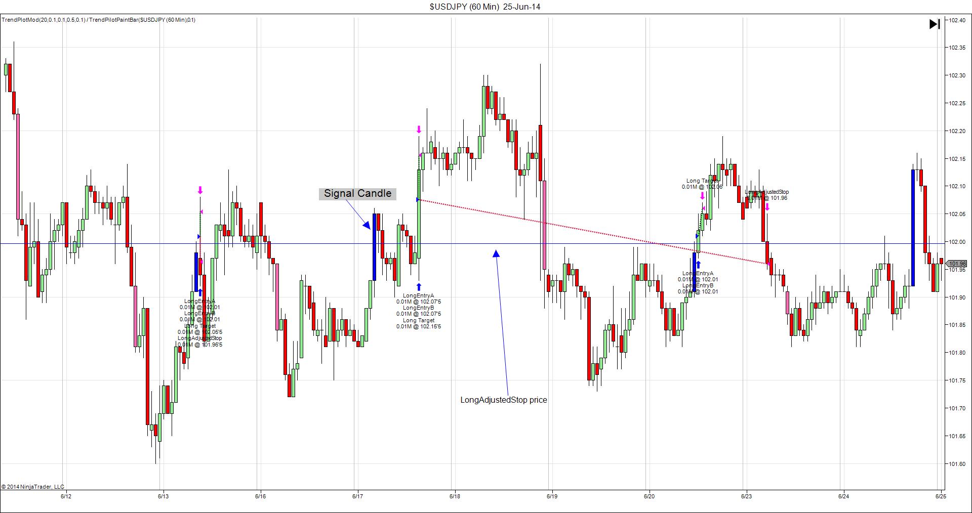 On the chart you will find a blue candle that I have named "Signal Candle". (Pay attention only to the blue candle that i have marked - not the other blue candles on the chart) This is the candle that every calculation is based on within this strategy. The Entry orders (there are 2 of them) are placed when this candle closes. The stop orders and the initial profit target is placed when the entry orders have filled. Their placements are based on a percentage of the signal candle As soon as the profit target is hit, then the initial stop order from the second entry is changed and that order is called LongAdjustedStop.
