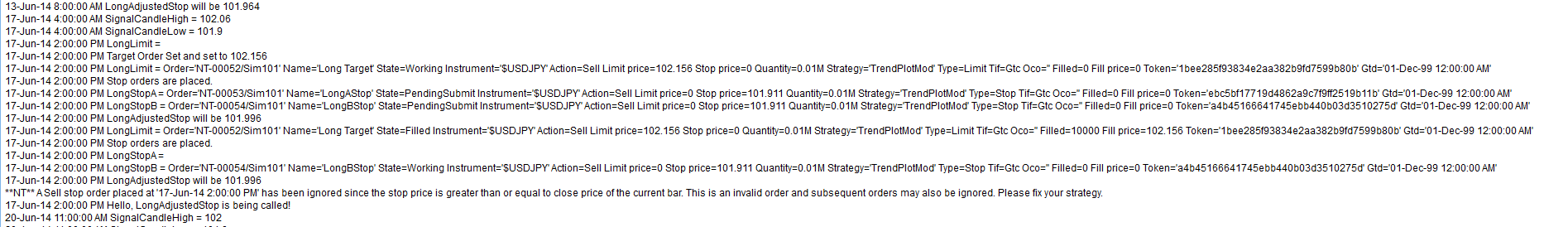 The blue horizontal line across the chart is the longAdjustedStop price. That is the price that NinjaTrader is calculating based on the Signal Candle and it is correct. The problem is that NinjaTrader is saying that it is equal to or above the closing price of the candle. But, this order does not get called until "LongTarget" is filled which you can see the candle that this happened on and the order is significantly below the close of this candle. The price of the Stop can be seen on the snippet of the output window that is attached.