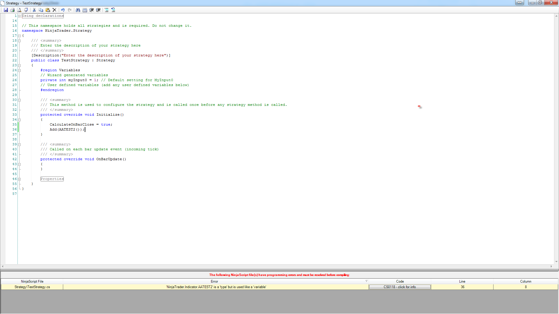 'NinjaTrader.Indicator.AATEST2' is a 'type' but is used like a 'variable'
