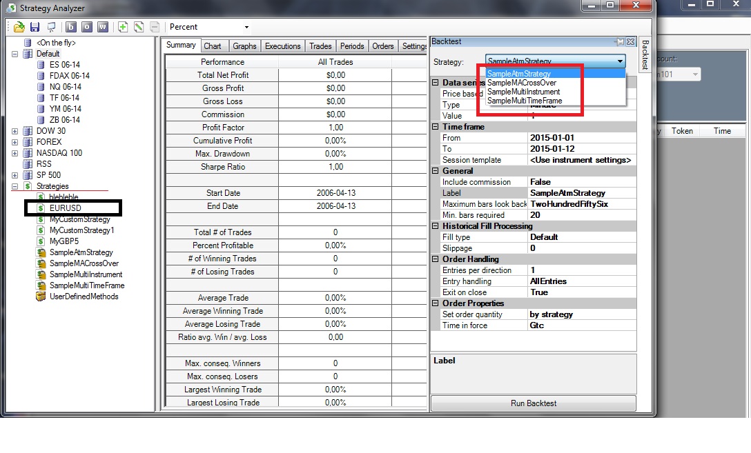 I wrote simple code of strategy. I tried to test it, but I couldn't. I didn't see my strategy name in the dialog window (appeared only 4 strategies from NinjaTrader). How can I back test my strategy?