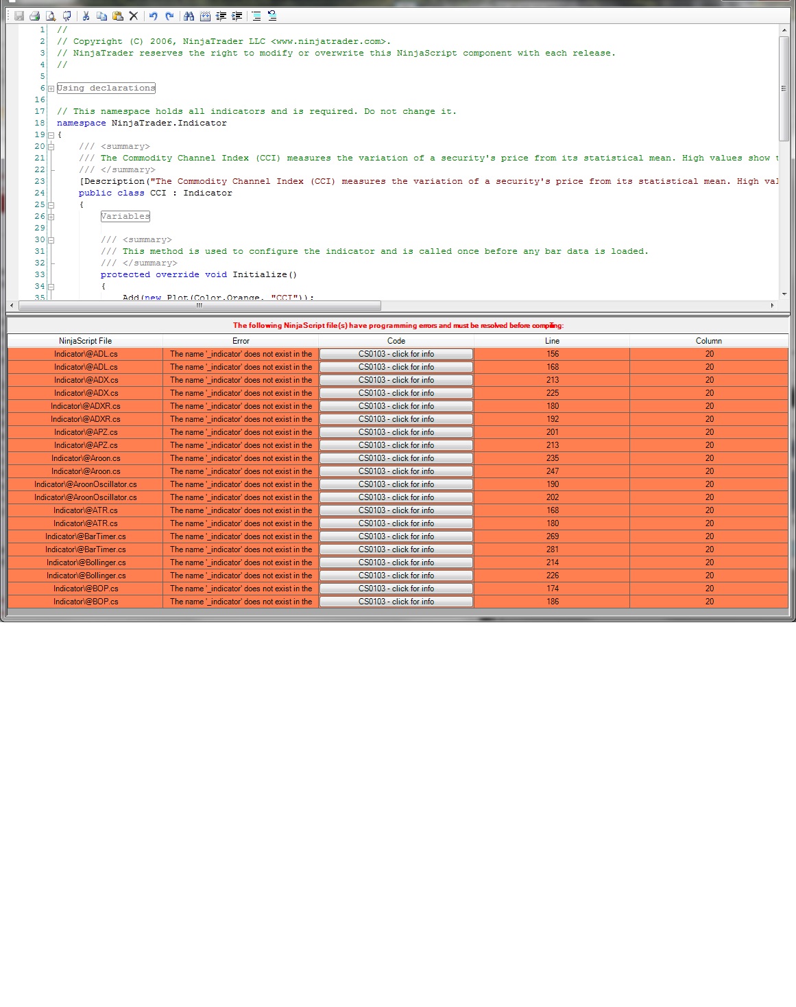 Please follow the instructions below to see where the errors are coming from after compiling the indicator. This will allow you to debug the indicator/strategy or remove it from your PC. If you are wondering why you receive an error when compiling only one indicator, it is because NinjaTrader always compiles all indicators and strategies - not just one. This is done to give you the highest runtime performance possible.