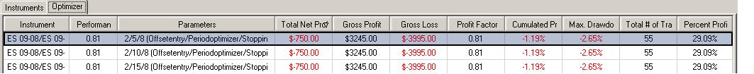 The latter screen shots are of backtested results manually entering the combinations of 2,5,8 in the first case, 2,10,8 in the second and 2,15,8 in the third. The only one that matches up is the first 2,5,8 and although it's on the top, the optimizations were supposed to sort "max profit". According the the separate backtests over the same dates, it's not the one that generates the maximum profit at all.