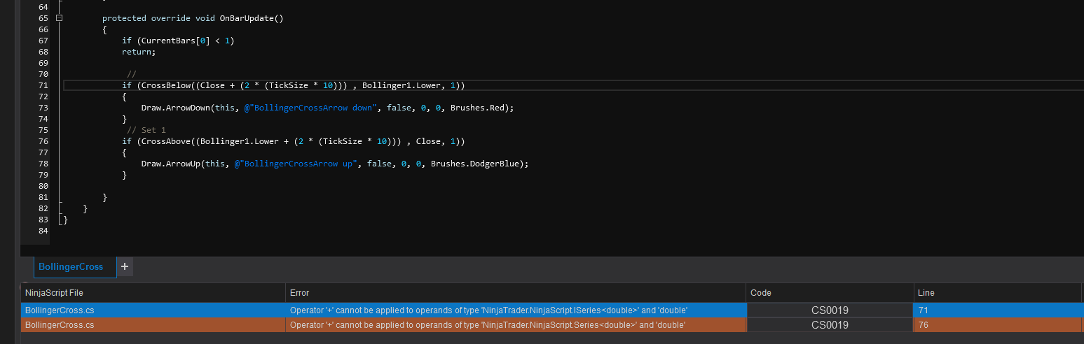If Price crosses and closes below the LowerBand, and the next candle is a lower close to that cross, then I want a sell signal (in this case that is simply a arrow pointing down).