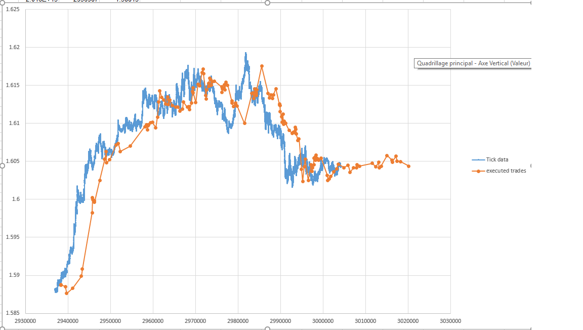 The backtested trade execution times and price are not consistent at all with the tick data (difference above the bid-ask spread).