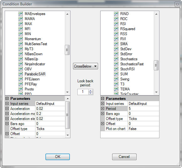 For instance: I'm trying to set the conditions for a strategy to Enter Long when the ParSar crosses below the 5-SMA. And to Enter Short when it crosses above the 5-SMA.