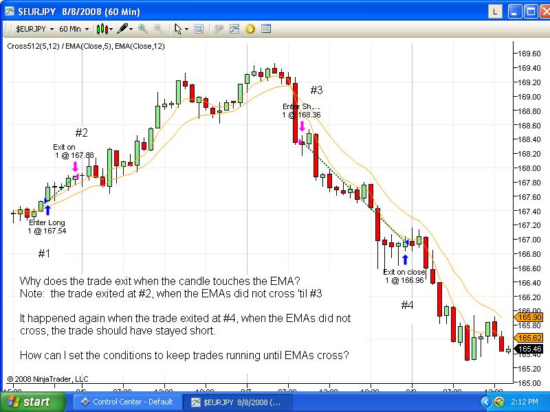 Please tell me how to set the conditions so the trade only enters and exits when the EMAs cross and not when the candle/price touches the EMA.