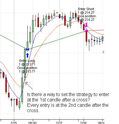 Question: Is it possible to set the strategy so the trade enters at the 1st candle after the crossover and not the 2nd candle?