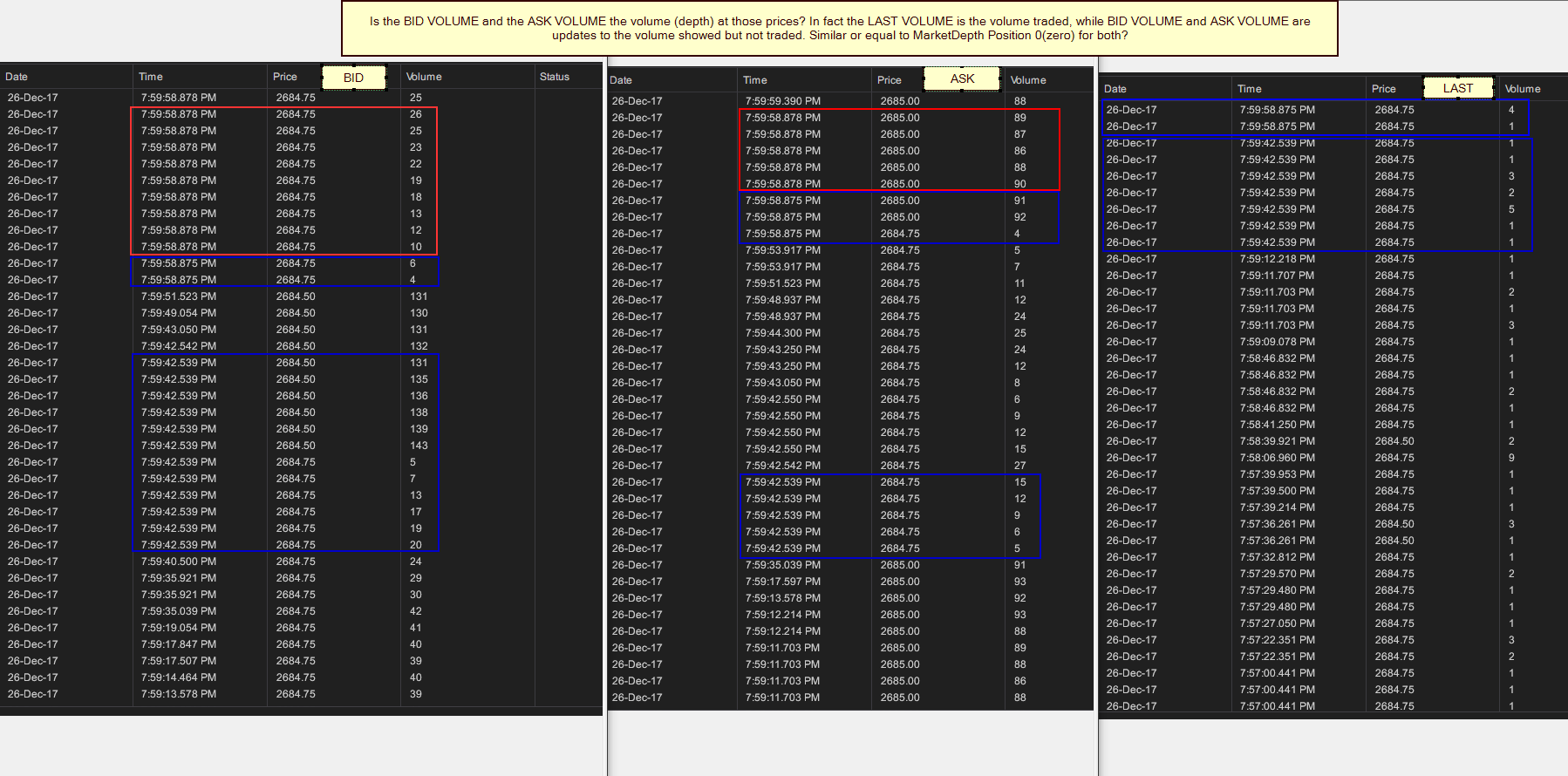 1. We require Bid/Ask Volume in our Addon. We did some research and just want Ninjatrader Support to confirm. We have attached a screenshot of the question. This regards the volume column of for Bid/Ask historical data. As we understand not all data providers provide this information but in our case, we do have this information. Does this information regard the volume present at the Bid/Ask similar to position 0 for each side in MarketDepth? What is the proper way to request this historical data via the Add-On? Via https://ninjatrader.com/support/help...eventargs.htm?