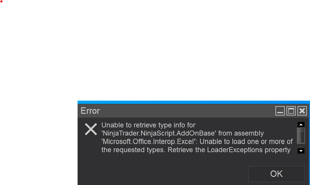 I have read previous threads discussing the error "Unable to retrieve type info for NinjaTrader.NinjaScript.AddOnBase from Assembly". This error can occur for many after upgrading NT to a new version when using 3rd party DLL's in one's scripts. Recently, the NewtonSoft dll which handles simple json experienced this error and would not load.