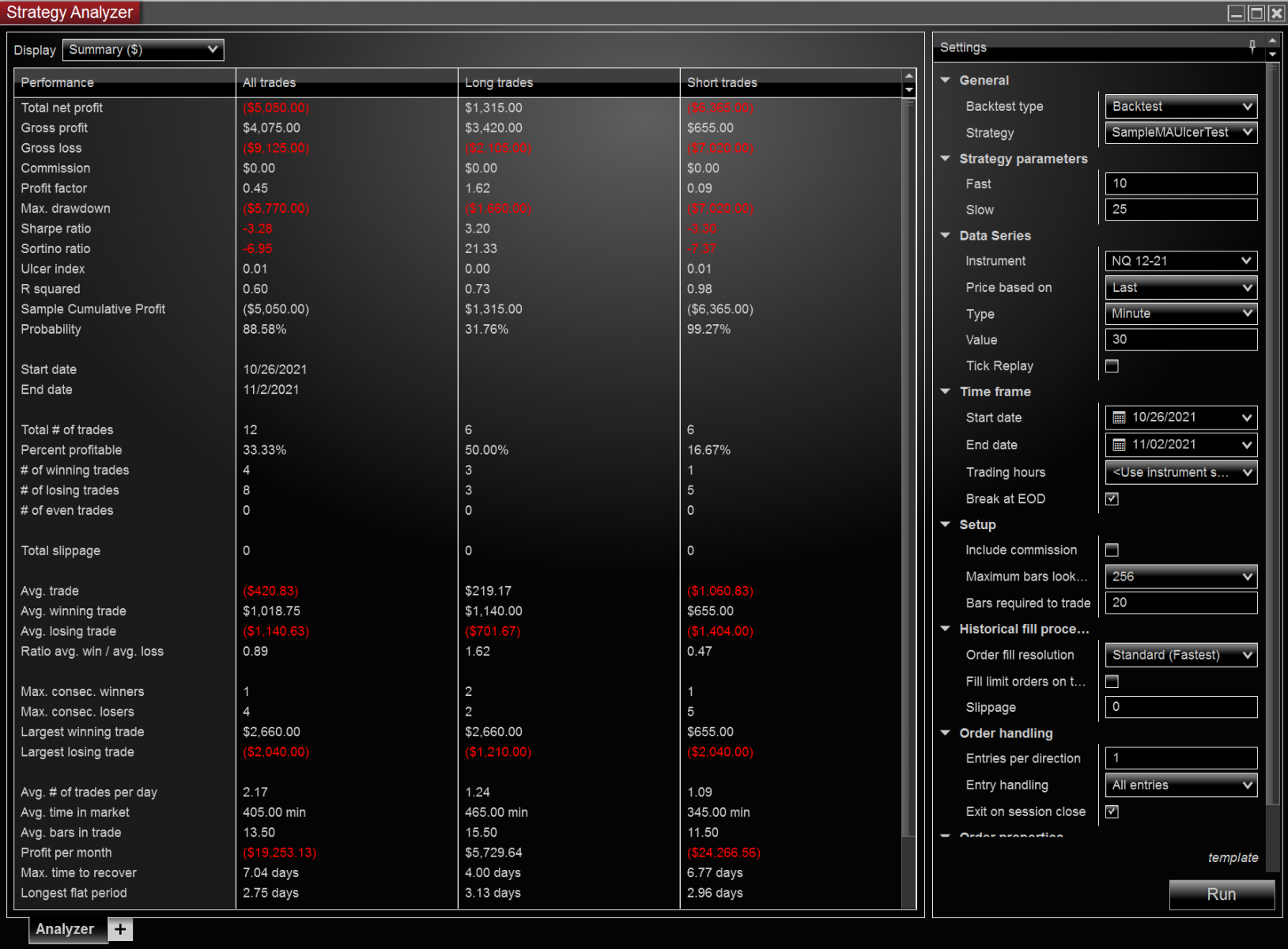 Also attached is a screenshot of the Strategy Analyzer summary. Note that the Ulcer index is rounded in the Analyzer.Trades: 12
