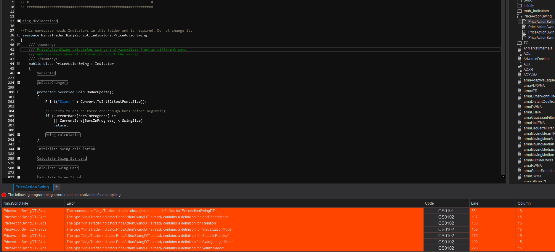 Hi Natan, It looks like this PriceActionSwing indicator is already installed. If you remove the file that you placed in the indicators folder and look at the indicators list it should be in there. If not, I will need to log into your PC through TeamViewer to see what is causing the conflict.