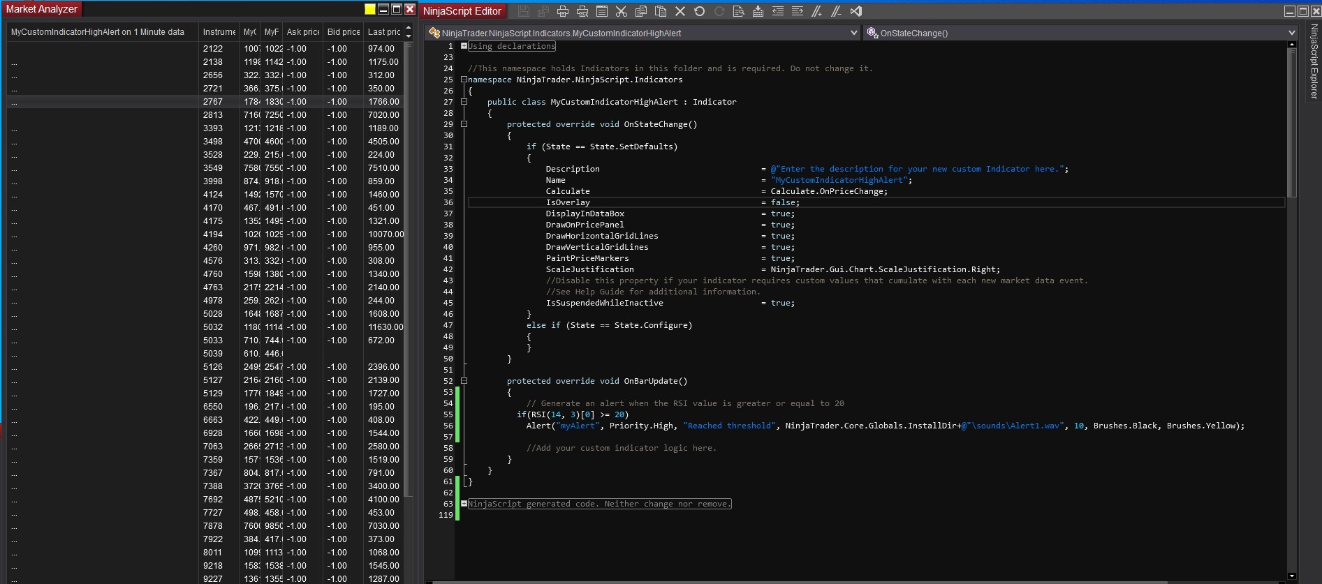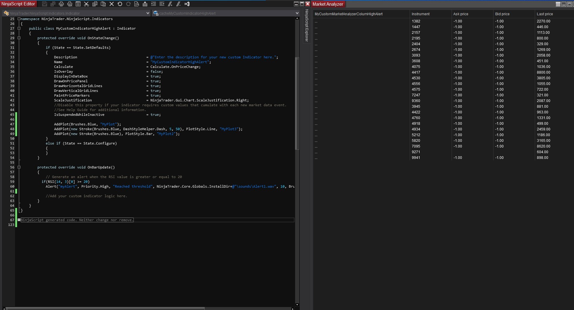 Please provide a sample code if possible.An alternative would be to use the NinjaScript alert function rather than trying to configure alerts in the user interface, that would be a better way to ensure the alerts are happening by physically programming the conditions for the alerts. You can then debug that use case using prints if you do that.