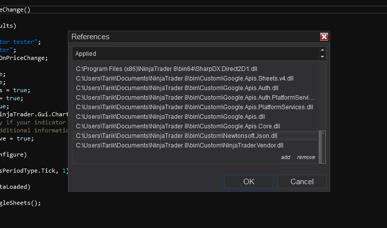 I'm trying to read and write to a google sheet. I've got it all working on a custom project but obviously would prefer/need to use it in Ninjatrader.