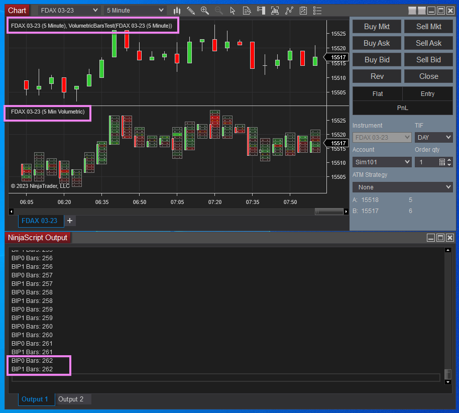 Note that since the added volumetric series is hard-coded to use FDAX 03-23 5-Minute, we add the test script to a chart with the same instrument and interval.