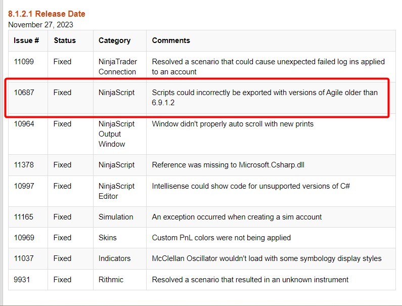 Since our support team does not have licensing for Agile and we depend on our development team to do testing with this, please perform the test below and write in to support[at]ninjatrader[dot]com to share your log and trace files for 8.1.1.7 and 8.1.2.1, the assembly exported from NT 8.1.2.1, a demonstration video showing the NT version, Agile version, and steps you are using when exporting a protected assembly from NT 8.1.2.1, and the source files included in the protected assembly export.