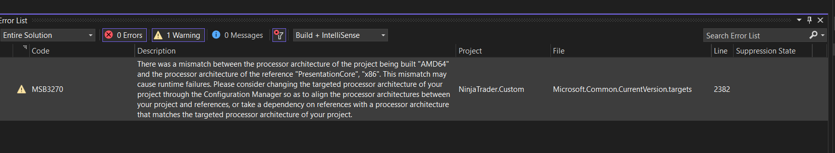 I created a custom indicator in the NinjaScript editor and then opened it in Visual Studio however I am getting a processor architecture mismatch error and have no clue how to correct this. Note that I am a bit of a newbie in C#/Visual Studio...Please see the attached screenshot.