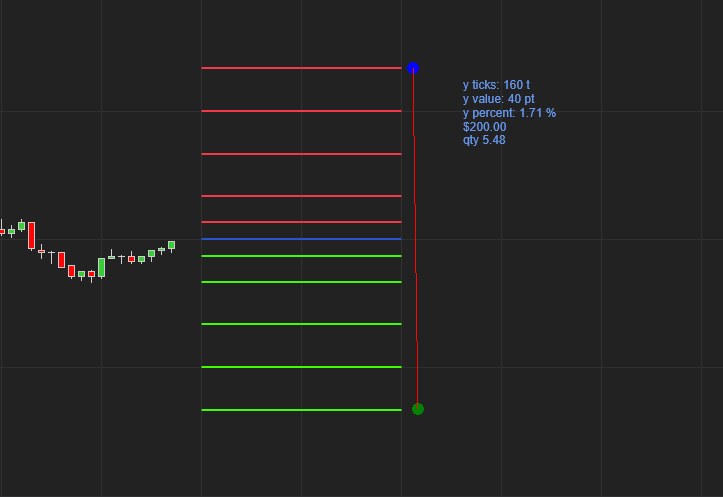 Hello, I want to create custom drawing tool. I want to click into chart and in the point where I click I want to draw line "0" which is middle line. Then I want to draw 5 lines on top of the middle line in distance +2, +5, +10, +15, +20 ticks from the middle line. Then I want to draw 5 lines underneath the middle line in distance -2, -5, -10, -15, -20 ticks from the middle line. I have managed to do it by copying Line drawing tool but the scaling seems off. Please see attached picture. Lines are on are which seems to be 6 ticks measured by another tool. I calculate y coordinate of the lines by taking y coordinate of the middle line and then adding in loop 2, 5, 10. I divide the values 2, 5, 10 by current tick size. I have also attached my code. Could you please help me? Thanks in advance