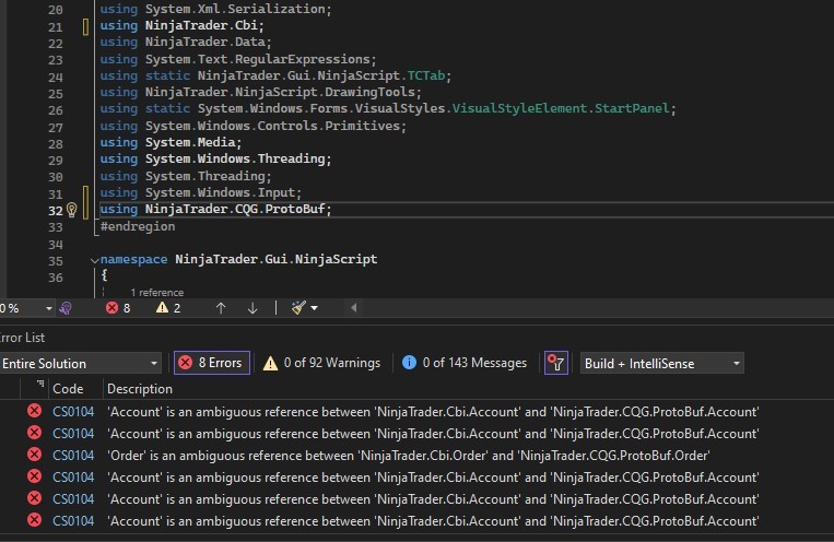 I have noticed that I cannot have NinjaTrader.CQG.Protobuf in my using declarations or else it gives ambiguity errors about Account and Order. But if I dont use the CQG, things do not work on CQG connections. How do I get around this? Attached it screenshot showing things.Tags: None