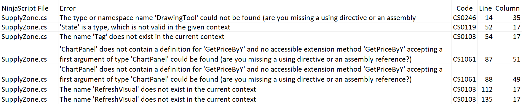 Here are the errors:Code:using System; using System.ComponentModel; using System.ComponentModel.DataAnnotations; using System.Globalization; using System.Windows; using System.Windows.Input; using System.Windows.Media; using NinjaTrader.Gui.Chart; using NinjaTrader.Gui.Tools; using NinjaTrader.NinjaScript.StrategyAnalyzerColumns; namespace NinjaTrader.NinjaScript.StrategyAnalyzerColumns.NinjaScriptColumns { public class SupplyZoneTool : DrawingTool { #region Properties [NinjaScriptProperty] [Display(Name = "FillOpacity", Description = "Fill opacity", Order = 1, GroupName = "Parameters")] public string FillOpacity { get; set; } [NinjaScriptProperty] [Display(Name = "FillColor", Description = "Fill Color of the zone", Order = 2, GroupName = "Parameters")] public string FillColor { get; set; } [NinjaScriptProperty] [Display(Name = "OutlineWeight", Description = "Thickness of the outline", Order = 3, GroupName = "Parameters")] public string OutlineWeight { get; set; } [NinjaScriptProperty] [Display(Name = "OutlineColor", Description = "Color of the outline", Order = 4, GroupName = "Parameters")] public string OutlineColor { get; set; } [NinjaScriptProperty] [Display(Name = "DistalPrice", Description = "Show prices on the distal edge of the zone", Order = 5, GroupName = "Parameters")] public bool DistalPrice { get; set; } [NinjaScriptProperty] [Display(Name = "ProximalPrice", Description = "Show prices on the proximal edge of the zone", Order = 6, GroupName = "Parameters")] public bool ProximalPrice { get; set; } [NinjaScriptProperty] [Display(Name = "OutlineOpacity", Description = "Opacity of the outline", Order = 7, GroupName = "Parameters")] public string OutlineOpacity { get; set; } #endregion private Point _startPoint; private Point _endPoint; private bool _drawing; protected override void OnStateChange() { if (State == State.SetDefaults) { Tag = "Supply Zone Tool"; // Set the name using Tag property // Set default values for properties FillColor = "Red"; FillOpacity = "40"; OutlineColor = "Red"; OutlineWeight = "3"; OutlineOpacity = "100"; DistalPrice = true; ProximalPrice = true; } base.OnStateChange(); } protected override void OnRender(DrawingContext dc, ChartPanel chartPanel) { base.OnRender(dc, chartPanel); if (_drawing) { // Calculate the rectangle dimensions double left = Math.Min(_startPoint.X, _endPoint.X); double top = Math.Min(_startPoint.Y, _endPoint.Y); double width = Math.Abs(_endPoint.X - _startPoint.X); double height = Math.Abs(_endPoint.Y - _startPoint.Y); // Convert FillColor and OutlineColor strings to Color objects Color fillColor = (Color)ColorConverter.ConvertFromString(FillColor); Color outlineColor = (Color)ColorConverter.ConvertFromString(OutlineColor); // Draw the rectangle dc.DrawRectangle(new SolidColorBrush(fillColor), new Pen(new SolidColorBrush(outlineColor), double.Parse(OutlineWeight)), new Rect(left, top, width, height)); // Calculate proximal and distal price levels double proximalPrice = chartPanel.GetPriceByY(top); double distalPrice = chartPanel.GetPriceByY(top + height); // Draw text labels for proximal and distal prices if (ProximalPrice) { FormattedText proximalText = new FormattedText(proximalPrice.ToString(), CultureInfo.CurrentCulture, FlowDirection.LeftToRight, new Typeface("Arial"), 10, Brushes.Black); dc.DrawText(proximalText, new Point(left, top)); } if (DistalPrice) { FormattedText distalText = new FormattedText(distalPrice.ToString(), CultureInfo.CurrentCulture, FlowDirection.LeftToRight, new Typeface("Arial"), 10, Brushes.Black); dc.DrawText(distalText, new Point(left, top + height)); } } } protected override void OnMouseMove(MouseEventArgs e) { base.OnMouseMove(e); if (_drawing) { _endPoint = e.GetPosition(null); RefreshVisual(); } } protected override void OnMouseDown(MouseButtonEventArgs e) { base.OnMouseDown(e); if (!_drawing) { _startPoint = e.GetPosition(null); _drawing = true; } } protected override void OnMouseUp(MouseButtonEventArgs e) { base.OnMouseUp(e); if (_drawing) { _endPoint = e.GetPosition(null); _drawing = false; RefreshVisual(); } } } } NinjaScript File Error Code Line Column SupplyZone.cs The type or namespace name 'DrawingTool' could not be found (are you missing a using directive or an assembly reference?) CS0246 14 35 SupplyZone.cs 'State' is a type, which is not valid in the given context CS0119 52 17 SupplyZone.cs The name 'Tag' does not exist in the current context CS0103 54 17 SupplyZone.cs 'ChartPanel' does not contain a definition for 'GetPriceByY' and no accessible extension method 'GetPriceByY' accepting a first argument of type 'ChartPanel' could be found (are you missing a using directive or an assembly reference?) CS1061 87 51 SupplyZone.cs 'ChartPanel' does not contain a definition for 'GetPriceByY' and no accessible extension method 'GetPriceByY' accepting a first argument of type 'ChartPanel' could be found (are you missing a using directive or an assembly reference?) CS1061 88 49 SupplyZone.cs The name 'RefreshVisual' does not exist in the current context CS0103 112 17 SupplyZone.cs The name 'RefreshVisual' does not exist in the current context CS0103 135 17