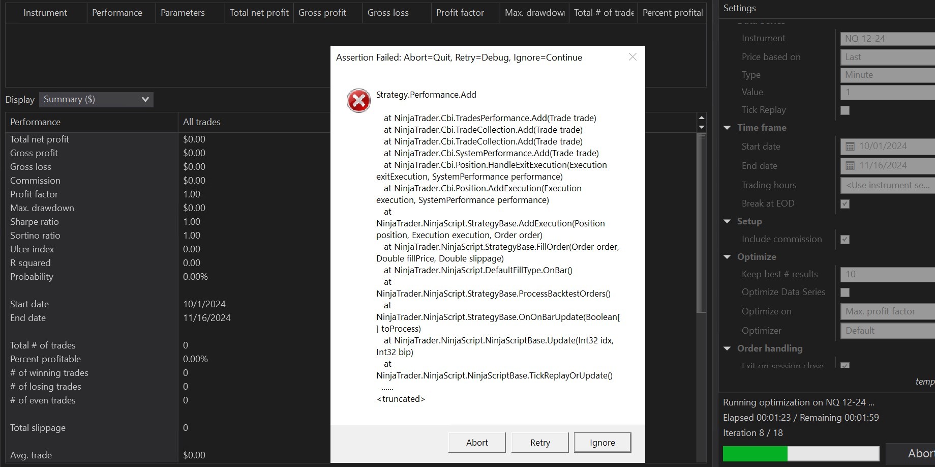 Error with StrategyAnalyzer - Ninjatrader freezes shuts down