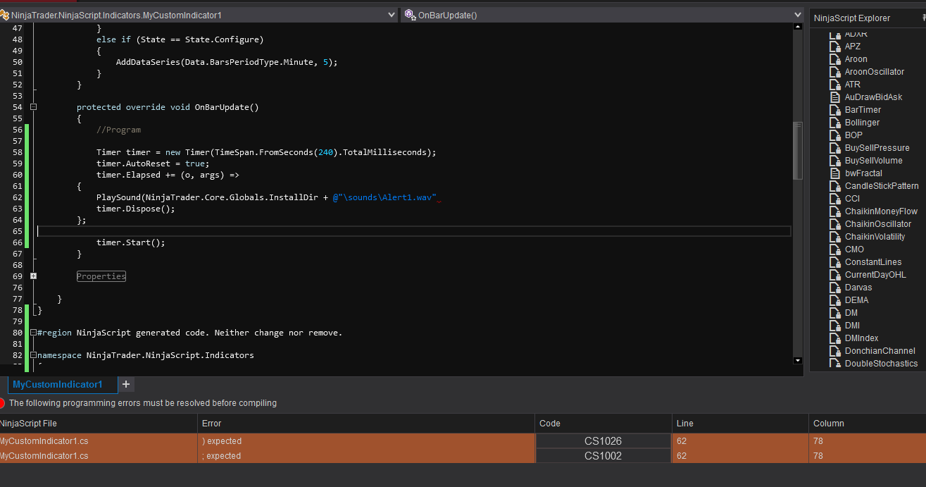 I am trying, this error appearsOriginally posted by reach4thelasers View PostI'm sure if you really apply yourself you will figure it out. Open the ninjascript editor, make a new indicator, and paste that into OnBarUpdate