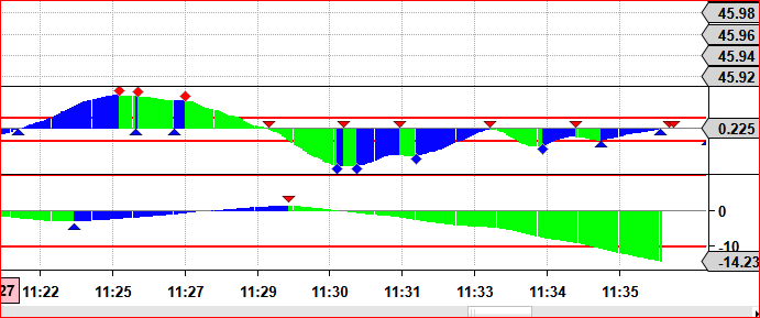 I have an Indicator that I plot in Two subpanels. The indicator for the most part works fine except for one feature. It plots a histogram in each panel. As the histogram changes direction the color changes. Where the color changes I place a Triangle or Arrow.