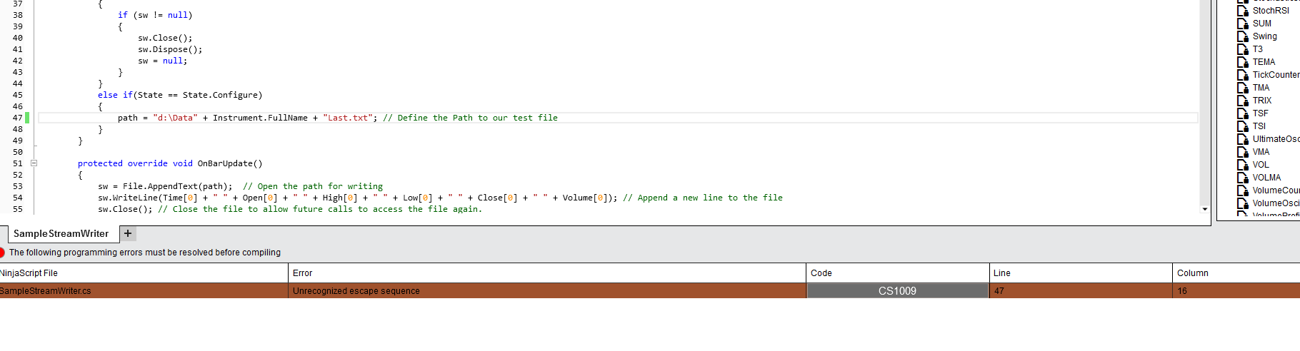 Just to be clear, in the support department at NinjaTrader we do not create, debug, or modify code for our clients. This is so that we can maintain a high level of service for all of our clients.