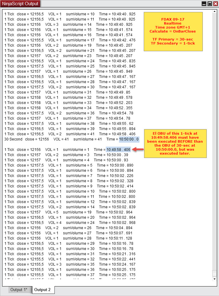 I am observing in real time that the OnBarUpdate method of many 1-tick bars are executed after the OBU method of the 30-sec bars, although its timestamp is earlier and should be executed earlier.