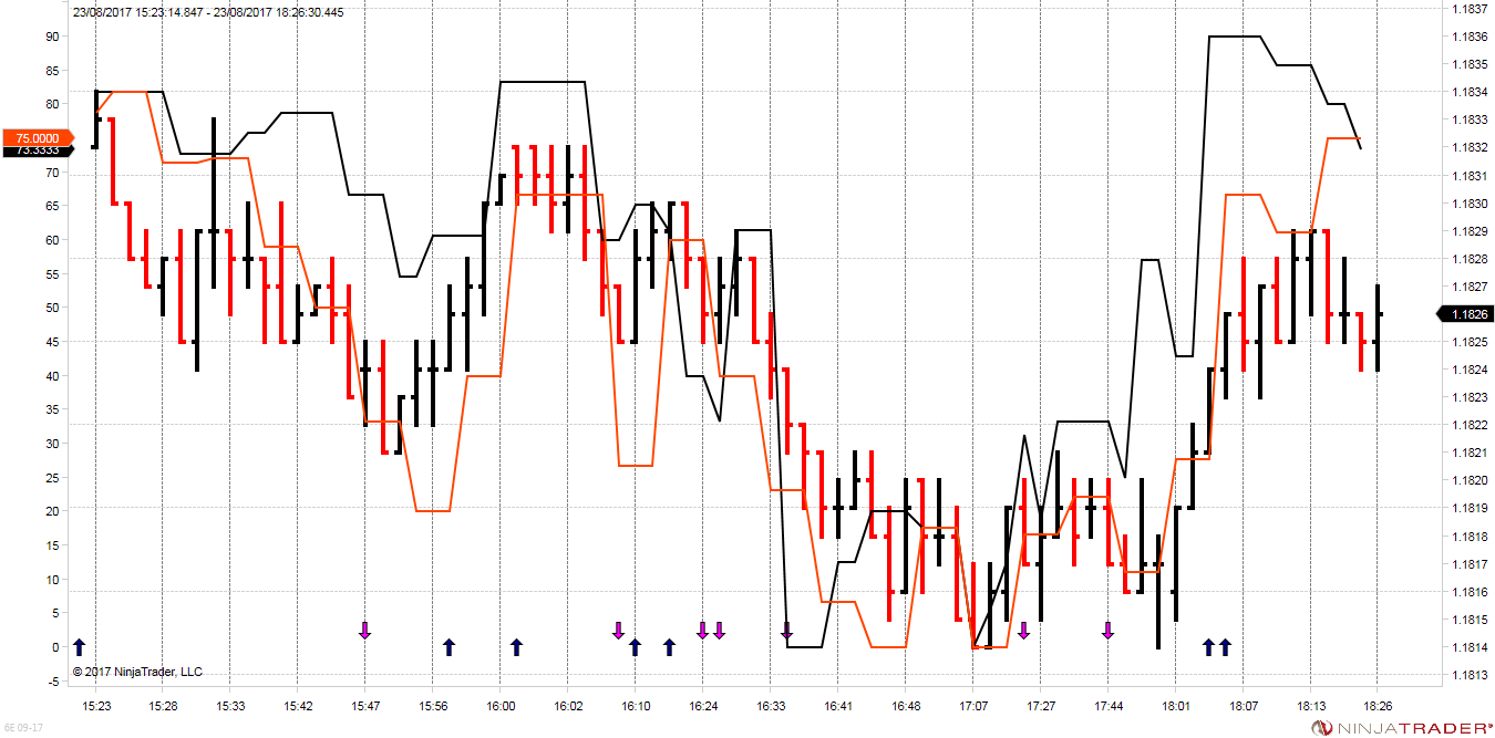 The screen shot shows an indicator scale on the left side and a price scale on the right. The price scale shows that price is in the area of 1.8. Looking at the arrows compared to the indicator scaling the arrows are plotted just above 0 and below 5 so I suspect the arrows are being plotted to the indicator scale and not on the price panel scale.