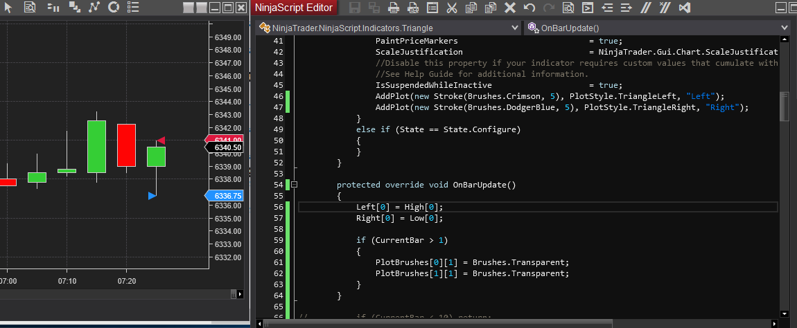 I wish to create an indicator that draws a left triangle to the left of the current price bar and right triangle to the right of the current price bar, how do I do that?