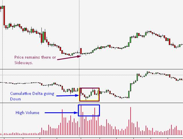 Price Remain sideways and Cumulative Delta Going Down with Volume Goes Up Too.Attaching Image For Example.