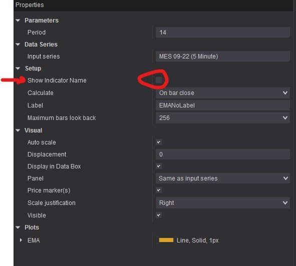 Code:public class EMANoLabel : Indicator { private double constant1; private double constant2; protected override void OnStateChange() { if (State == State.SetDefaults) { Description = NinjaTrader.Custom.Resource.NinjaScriptIndicatorDe scriptionEMA; Name = "EMANoLabel"; IsOverlay = true; IsSuspendedWhileInactive = true; Period = 14; [B]///added Display name[/B] [COLOR=#27ae60][B]DisplayIndicatorName = false;[/B][/COLOR] AddPlot(Brushes.Goldenrod, NinjaTrader.Custom.Resource.NinjaScriptIndicatorNa meEMA); } else if (State == State.Configure) { constant1 = 2.0 / (1 + Period); constant2 = 1 - (2.0 / (1 + Period)); } } [B]///added Display Name[/B] [COLOR=#27ae60][B]public override string DisplayName { get { if (State == State.SetDefaults) return Name; else if (DisplayIndicatorName) return Name; else return ""; } }[/B][/COLOR] protected override void OnBarUpdate() { Value[0] = (CurrentBar == 0 ? Input[0] : Input[0] * constant1 + constant2 * Value[1]); } #region Properties [Range(1, int.MaxValue), NinjaScriptProperty] [Display(ResourceType = typeof(Custom.Resource), Name = "Period", GroupName = "NinjaScriptParameters", Order = 0)] public int Period { get; set; } [B]///Display Indicator Name[/B] [B][COLOR=#27ae60][NinjaScriptProperty][/COLOR] [COLOR=#27ae60][Display(Name="Show Indicator Name", Description="Draw a symbol to mark change in direction", Order=1, GroupName="Setup")] public bool DisplayIndicatorName { get; set; }[/COLOR][/B] #endregion }