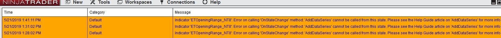 You would instead need to make your code look like the help guide or other scripts show and have mutliple states:Code:protected override void OnStateChange() { switch (State) { case State.SetDefaults: Name = "ETOpeningRange_NT8"; Description = "Opening Range indicator"; [B] Initialize(); // <---- running all your code for State.SetDefaults [/B] break; } }