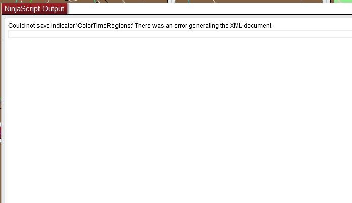 This NT8 ColorTimeRegion indicator is a converted NT7 indicator. Everything functions correctly with the indicator and it compiles error free. Problem is, when I try to save the indicator settings to a template, I get an XML error, also, when trying to save the Workspace, I get an error as well. I have attached the indicator and screen shots of the errors. Any help would be appreciated.