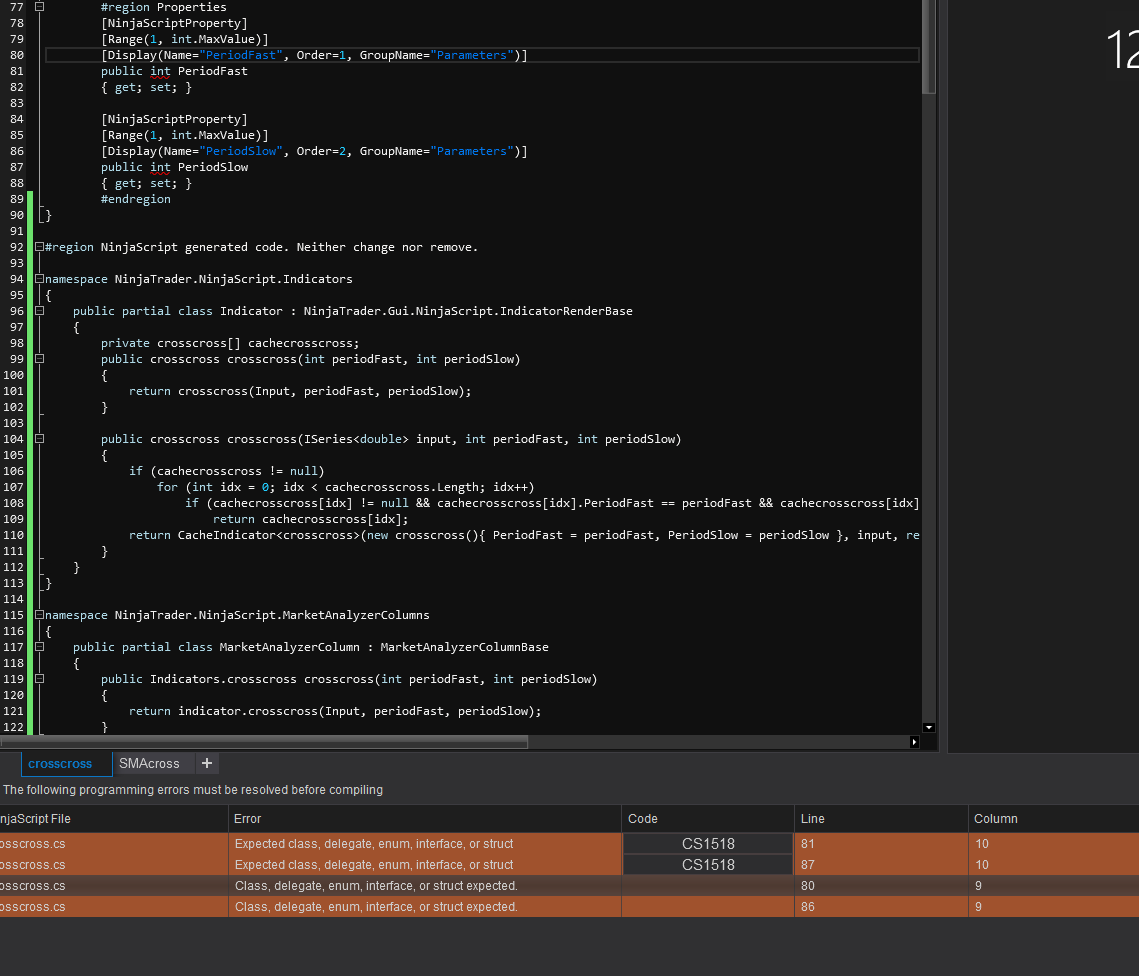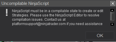 If you are unsure as to what the error is indicating, please take a screenshot of the NinjaScript File column and Error column fully visible (not to be confused with the Code column)