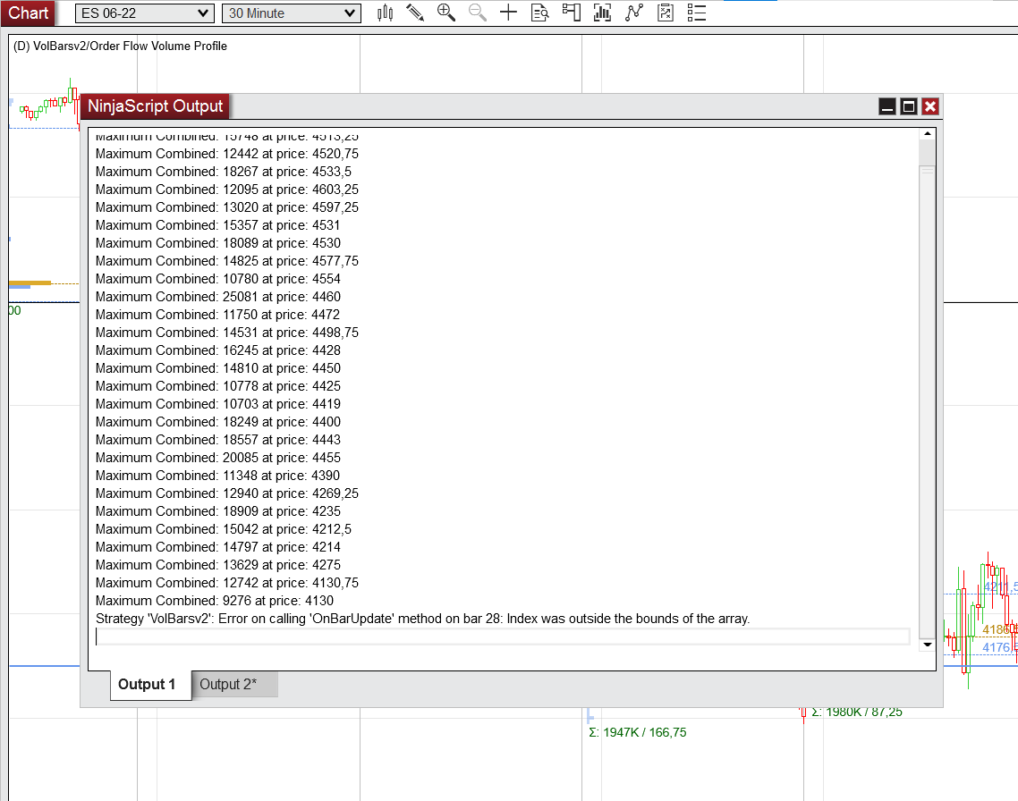 Print("Maximum Combined: " + barsType.Volumes[CurrentBars[0]].GetMaximumVolume(null, out price) + " at price: " + price);