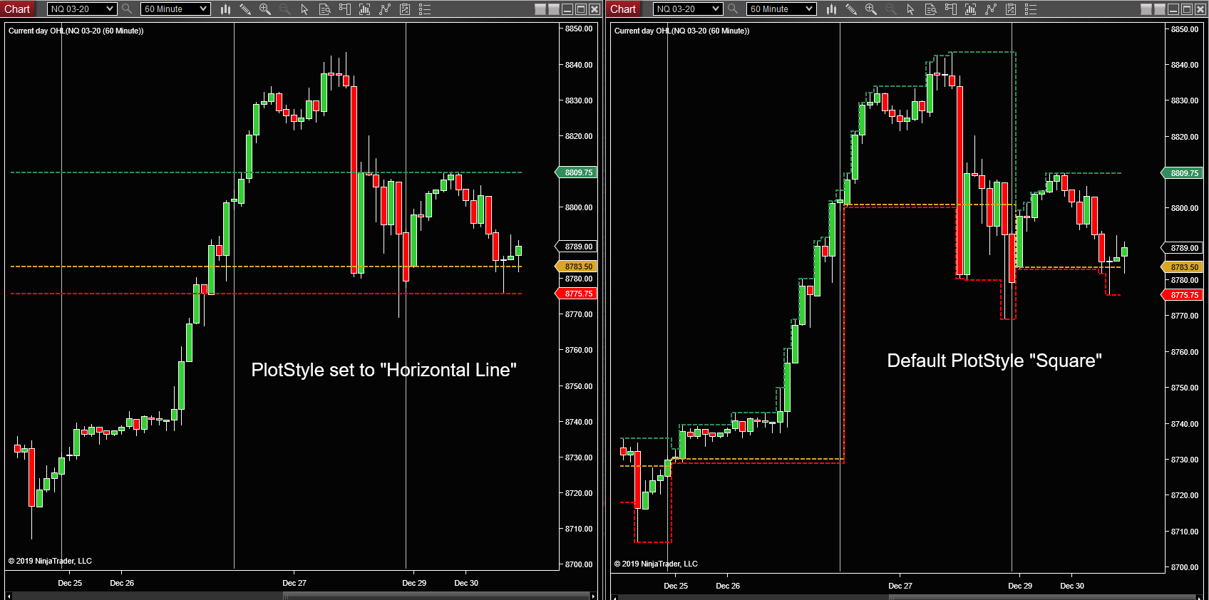 With the indicator you do have adjustments to the way it is displayed. So to meet your definition of "The current hi or low for the day has one value, that value should be represented by a horizontal line by the Current Low high indicator at the current value not show an historical staircase of values of old highs and lows." you can change the indicators default display settings. In the indicator panel, expand each of the plots and change the "PlotStyle" from "Square" to "Horizontal Line". I've have attached an example of both "Horizontal line" and "square". I left them both with their "dashStyle" set to Dash and a width of 2, these can also be changed to your suit your needs.