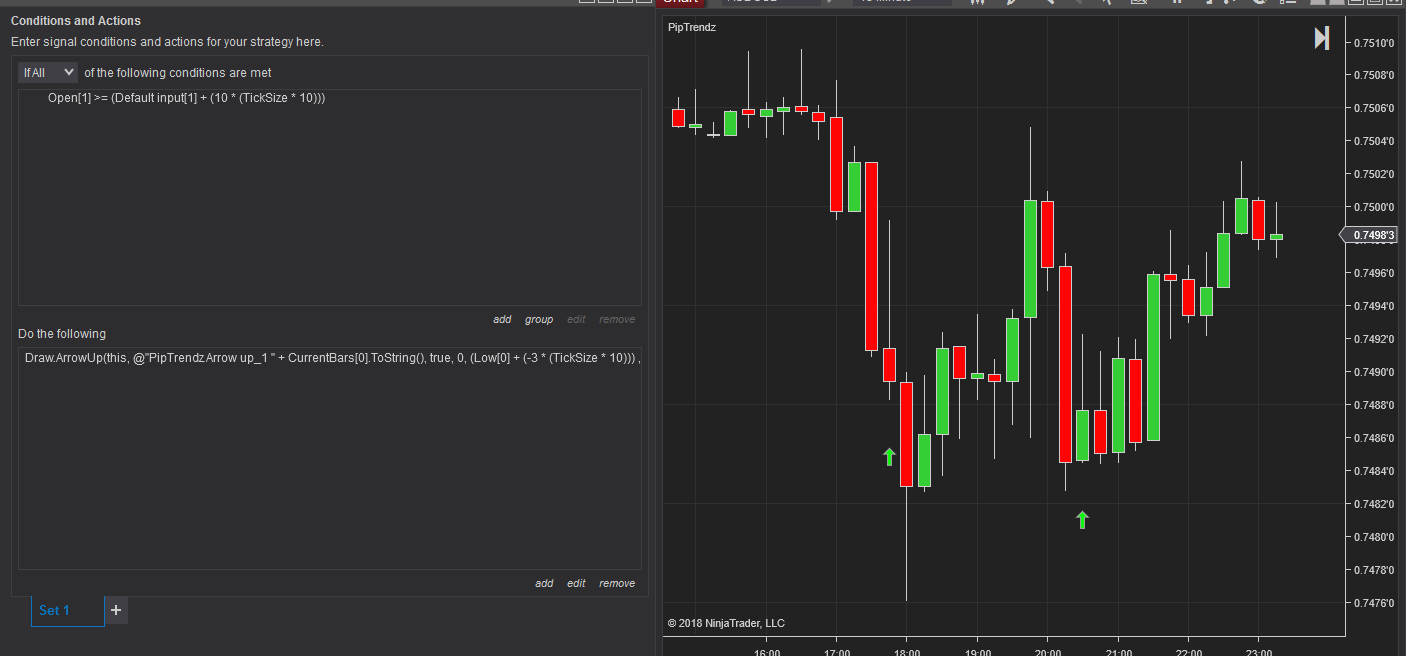 In the screenshot I copied your coding in the strategy builder, so yes it is working. I applied it to 15 minute bars because a short bar greater than 10 pips was rare on faster time frames. You might try reducing the 10 pips requirement to see if you can observe any arrows.