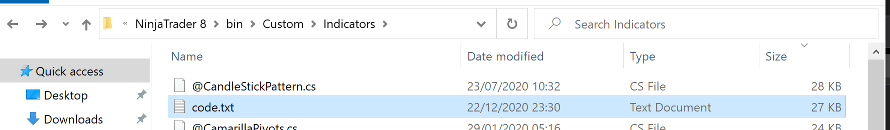 I put code.txt .. inside of \Documents\NinjaTrader 8\bin\Custom\Indicators