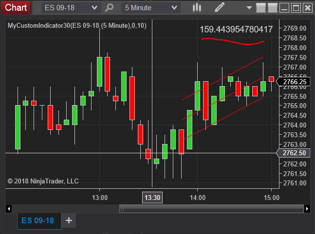 I put together a sample which will draw text in the upper right hand corner of the chart, the angle of the regression line which is drawn by the indicator between 0 and 10 bars ago.