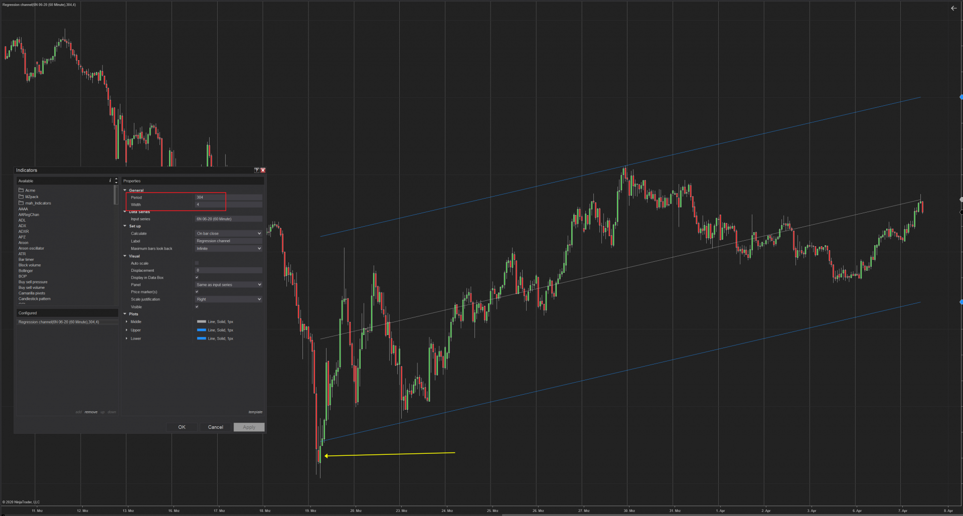 I use a regression channel with 304 periods and a width of 4. That means I have a standard deviation of 2 by each side (95,45%).