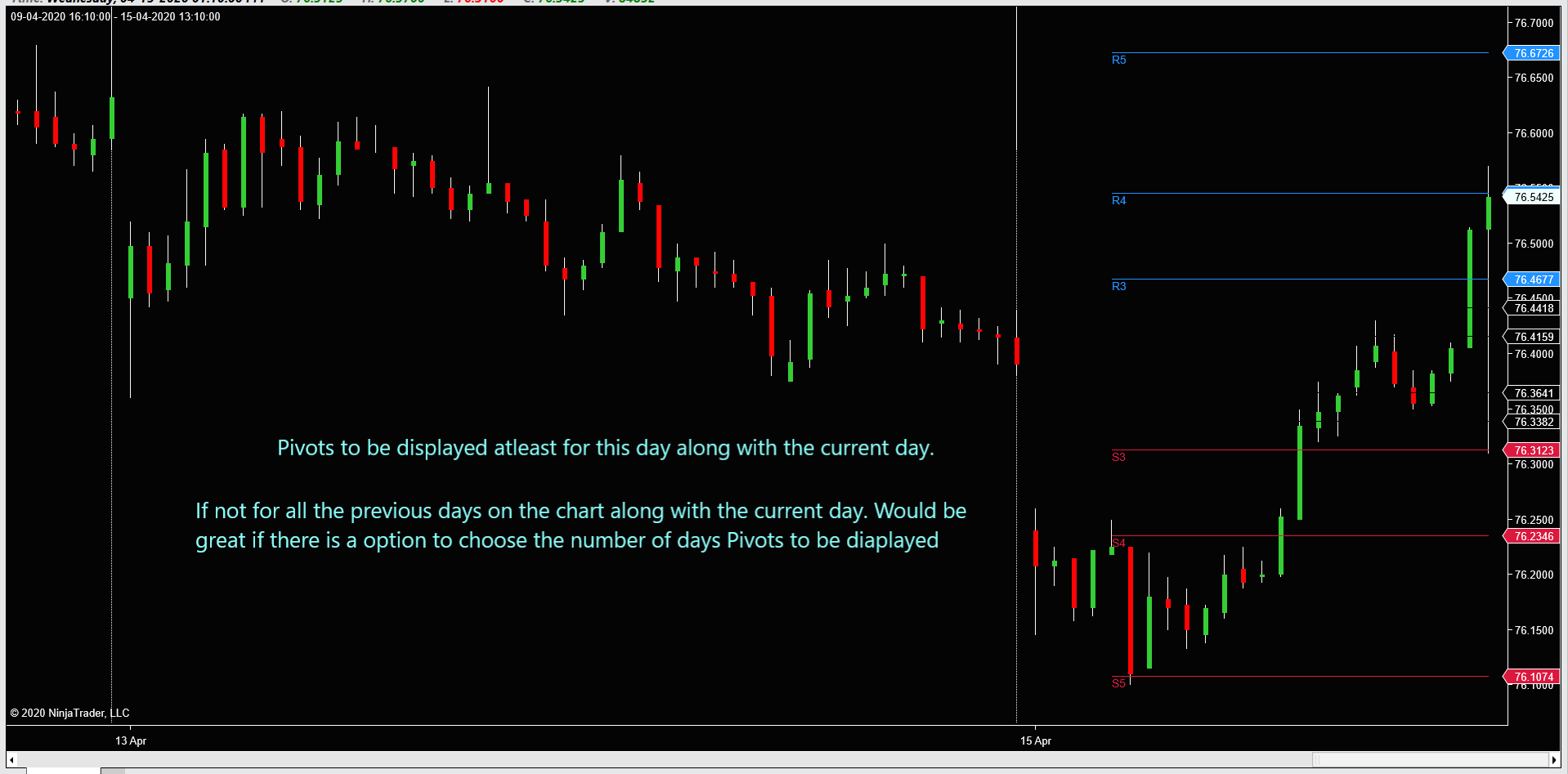 I am looking for an option to have Pivots to be displayed for the previous day. Is there an option with the built in Camarilla NT8 indicator, if not can some one help me with the require code so that the previous days pivots are displayed.
