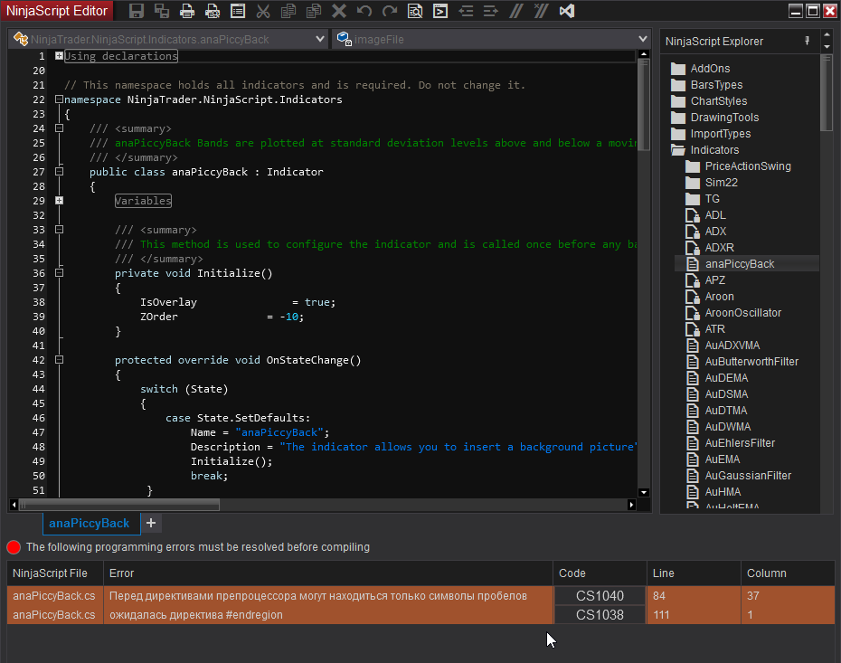 When compiled in NT8, I showed 2 errors, "Class memeber declaration expected" and "The constructors name match the containing type's name". Code CS 1040 and Code CS 1038.