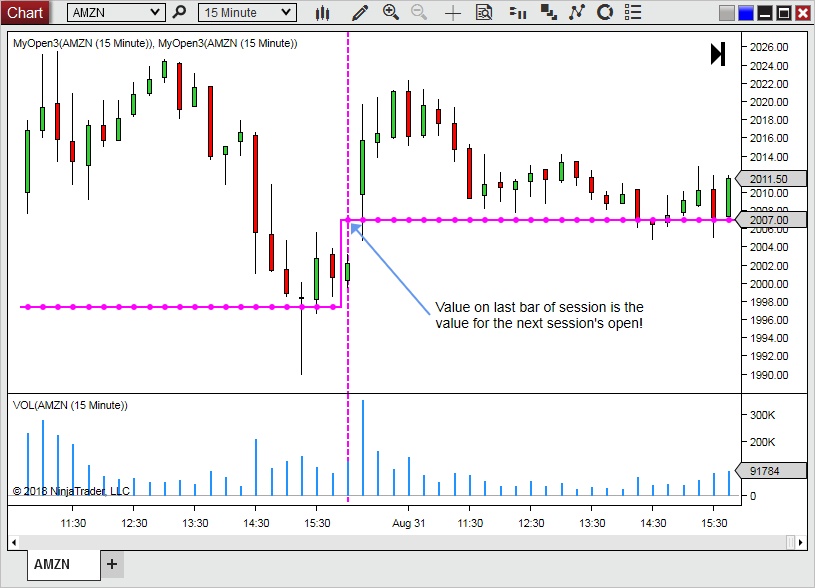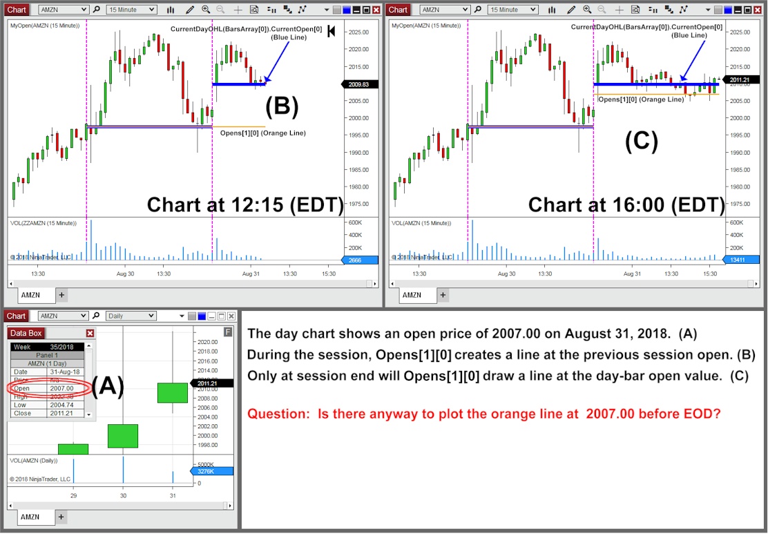 On days where there is no discrepancy between day and intraday data, the solution is to use CurrentDayOHL(BarsArray[0]).CurrentOpen[0]; However on days when there are discrepancies between day and intraday data, is there any way to retrieve the open price as shown on a day-bar chart, and use that data for plotting values on an intraday chart?